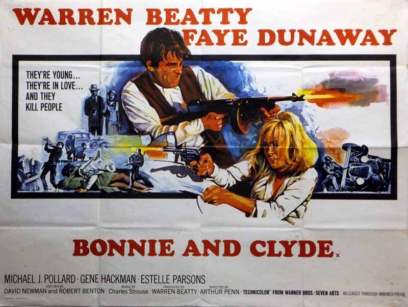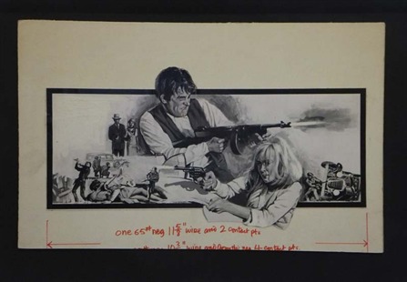 An interesting cut-out b/w photo of Chantrell's finished artwork for the Quad poster for "Bonnie & Clyde". The photo has been mounted on card with technical instructions for the printers (?) written underneath. Chantrell has added painted highlights to the discharging guns & to Faye Dunaway's hair. The whole piece measures 11"x 16" & has a tracing paper overlay for protection. For comparison we also show the finished Quad poster (image courtesy of