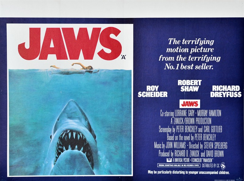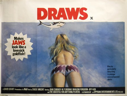 This zany American sketch show comedy was imported by David Grant & unashamedly set up as a "Jaws" spoof to capitalise on the success of the 1976 blockbuster. It is surprising that the poster didn't attract legal objections but as the film was launched in the USA as "American Tickler" & was fronted with a completely different poster campaign, the British "Jaws" version passed under the radar of litigation. The fact that the film was not a commercial success here also helped. As the print run was modest only, this title is extremely rare. Again, Chantrell's sense of humour comes to the fore with this poster design. Of interest to Chantrell collectors & Jaws completists alike. This is an unfolded Chantrell Printer's Proof. For the purpose of comparison, the original "Jaws" Quad poster is also shown (image courtesy of www.moviepostermem.com)