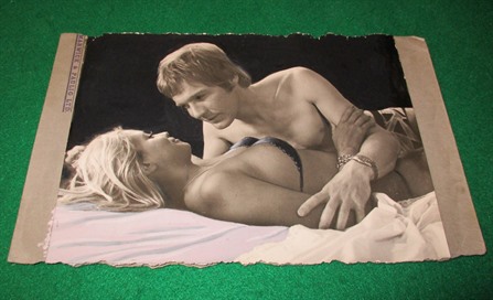 A b/w over-painted photo mounted onto artboard (7 1/2"x 12") from "The Virgin Soldiers" (1969) showing a chap in Union Jack pants with an attractive blonde.This is curious item has had various painted annotations. It looks like the blonde was topless & that a bra has been painted on. The black background & "sheets" bottom left are painted & eye-lashes & hair have been further highlighted. We've seen similar over-painted photos in the archive but are unsure what this particular example was done for (artist