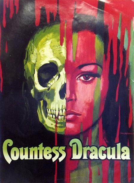 This is a large colour photo (13 7/8"x 18 1/2") of one of the two painted pre-production designs, Chantrell created for Hammer for the forthcoming film "Countess Dracula" (these designs believed to date c' 1970). This item was clearly used in the internal production process for the ensuing printed flyers (an example shown below), as it comes with an original fold-over paper cover sheet. There have also been minute pen touch-ups to the corners & small creases (these done at the time by Chantrell) but please note, this is a photo of the artwork & NOT the actual painted artwork itself. Nonetheless, a fascinating piece of original Chantrell/Hammer memorabilia & an excellent size to frame.