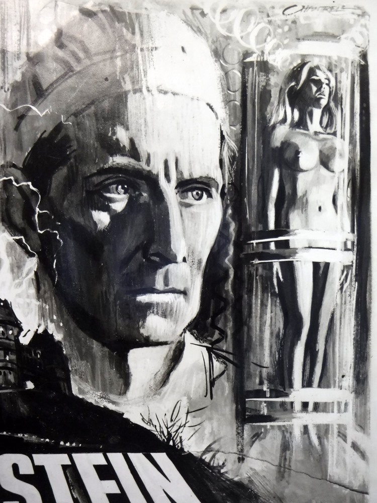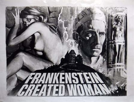 An interesting b/w photo (14"x 18") of Chantrell's prototype artwork for the Quad poster for "Frankenstein Created Woman" (1967). Although the imagery is a close match to the Quad poster (see below - image courtesy of emovieposter.com), the prototype shows only one branched tree on the left hand slope & most crucially, the finished Quad presents the girl (top left) clothed rather than topless!