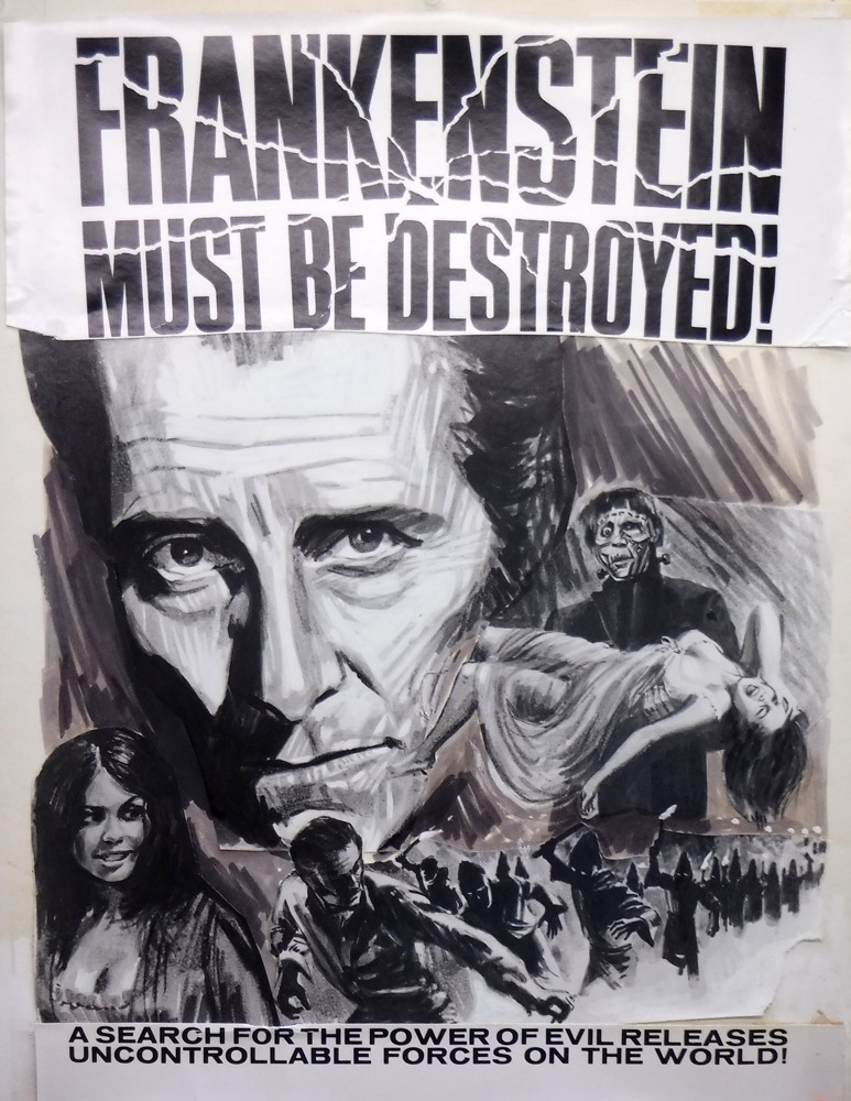 A really unusual prototype composition (16 1/2"x 21") for the Hammer Film "Frankenstein Must Be Destroyed" (1969). The composition consists of b/w cut-out photos of Chantrell artwork which have been pasted onto artboard with subsequent hand-painted additions (especially to Peter Cushing). The background has also been painted in. To the upper & lower rim are strips of text including the "fractured" title script.