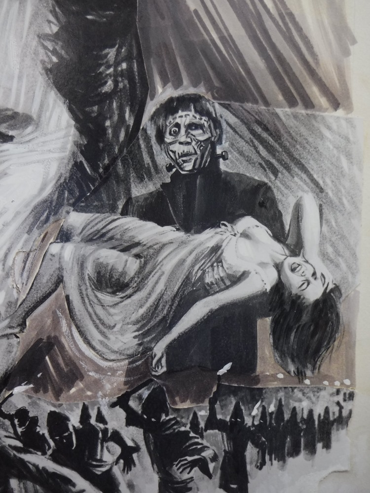 As comparison with the printed Quad shows, this composition is an early prototype. The fact that "Frankenstein" looks nothing like he does in the film, suggests this piece was a pre-production creation (ie, destined as an artwork or marketing brochure to help Hammer secure funding for the film). An important original piece of Chantrell/Hammer memorabilia.