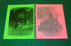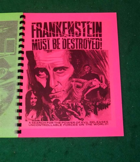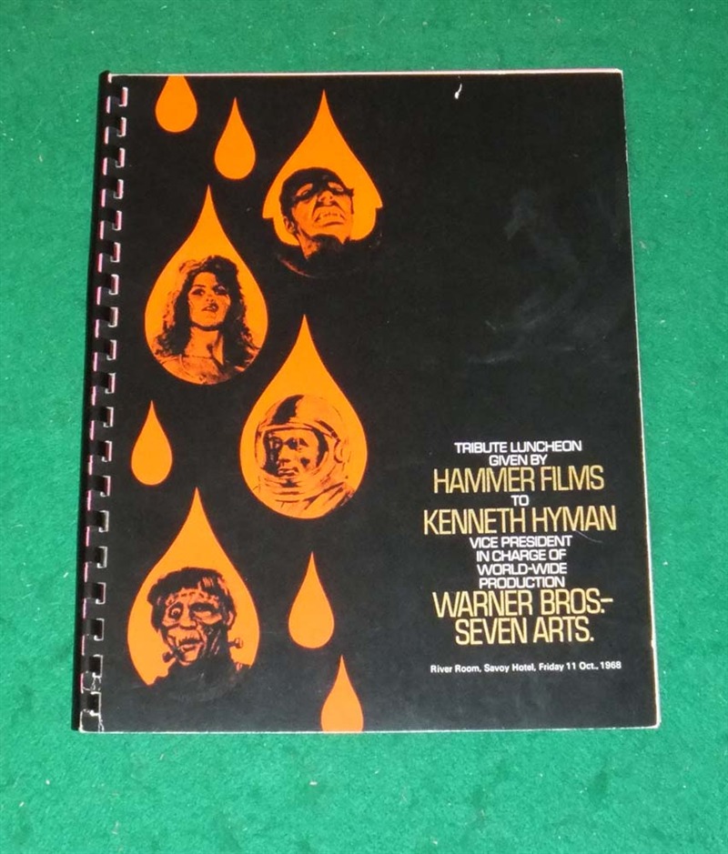 A really fascinating piece of Hammmer/Chantrell memorabilia, this being a bespoke "programme" for a tribute lunch for Kenneth Hyman (VP of Warner Bros-Seven Arts) hosted by Hammer Films, at the Savoy Hotel, London, 11th Oct 1968. Apart from the menu itself, this Chantrell designed brochure contains 4 photographic negatives of Chantrell's poster artwork for Hammer, namely "Dracula Has Risen From The Grave", "When Dinosaurs Ruled The Earth", "Moon Zero Two" & "Frankenstein Must Be Destroyed". Each negative can be seen against a day-glo card which brings the artwork to life & each is separated by a plastic page.