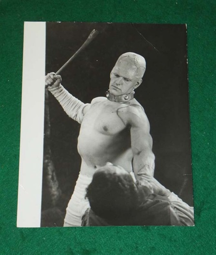 An original photo still (8""x 10" approx) used by Chantrell to help him create the prototype poster artwork for this Hammer film. The still shows the monster (David Prowse) killing a woodsman, this detail & the official Hammer stamp carried to the reverse. Though Chantrell did not produce artwork for the finished Quad, his prototype artwork (shown on a page extract from the Marcus Hearn book "The Hammer Vault" (2011)), was used by Hammer in markewting pitches to secure financing for the film.