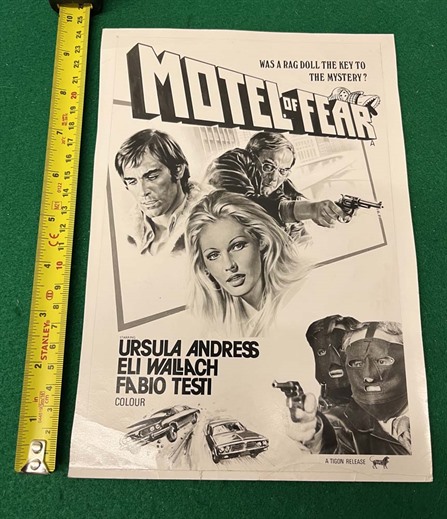 A b/w photo (6 7/8"x 9 3/4") showing Chantrell artwork for a poster for the Canadian-Italian film "Motel of Fear" (1973) aka "Stateline Motel".