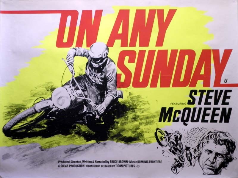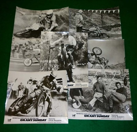 A rare collection of 7 original 8"x 10" front-of-house Stills for the film "On Any Sunday", the motorbike documentary also featuring Steve McQueen. Though better known for their Exploitation fare, Tigon Pictures pounced on the distribution of the film because of McQueen's popularity & as the Stills show his presence was marketed prominently. The budget for the Poster design for the film was limited & it is likely that the only reference material Chantrell was given were these Stills (& possibly Stills from Steve McQueen's "Le Mans" which was also released in 1971). One Still in particular was very clearly the inspiration behind Chantrell's Poster design. Some Stills are slightly creased or have the odd edge nick but these are rare pieces in any condition.