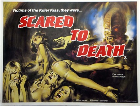 The sepia like tone & the choice of wavey like font for the title, help to convey a suitably foreboding atmosphere. With his astute sense of commercial realities, Chantrell also gives prominence to several appealing females. The film itself was clearly influenced by "Alien", featuring a spinal fluid sucking monster and an array of unfortunate bimbos.