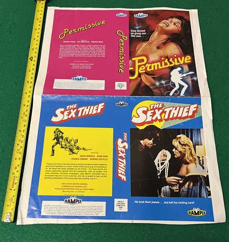 Unusual Video cover Printer's Proof (13"x 17" approx) for the British sex film "Permissive" (1970) together with the sex-comedy "The Sex Thief" (1973) PLUS a separate un-used video cover (8 1/4"x 11 1/4") for "Permissive".