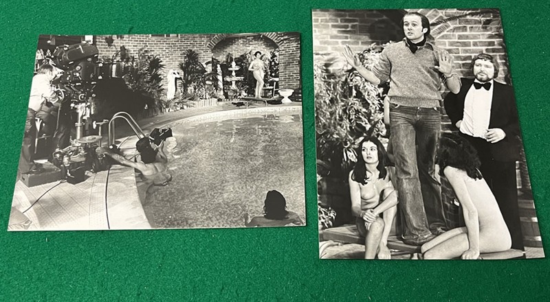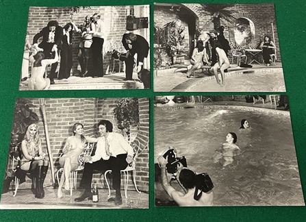 informal shots taken during the pool scene. Ms Millington can be seen in three photos with Alan Lake & Derren Nesbitt (?) also in several. In some photos, the camera crew are also visible. This material was supplied to Chantrell for reference purposes prior to him creating the Quad poster for the film (see: