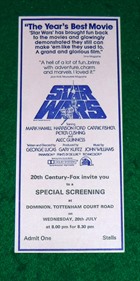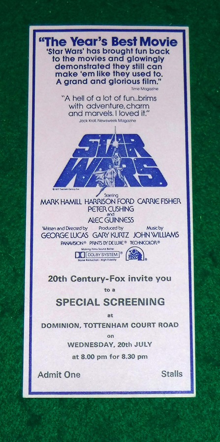 A UK Special Screening/Press Show Invitation (1977), for the very first "Star Wars" film, on 20th July 1977. This item belonged to poster artist Tom Chantrell. The "Star Wars" Invitation bears the earlier Hildebrandt Star Wars design. This is significant as Chantrell was commissioned to create an alternative poster for the British release of the film. Chantrell was invited (with his family) to this Special Screening to help provide inspiration. Chantrell's iconic "Style-C" poster design was the result (see below) but it is fascinating to think that this screening event proved to be the catalyst for the creation of one of the most immediately recognisable of all 20th cenury cinema poster images. A fascinatin piece of Star Wars & Chantrell memorabilia.