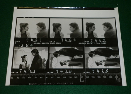 A large original Photo Contact Sheet (12"x 16") used by Tom Chantrell for reference in the design of his iconic Poster for the Film. NB. The Poster image is included here for reference only & is NOT sold with this item. The Contact Sheet shows Han Solo & Princess Leia rehearsing two scenes. The Sheet has two vertical foldlines. A fascinating & rare piece of original 1977 "Strar Wars" memorabilia.