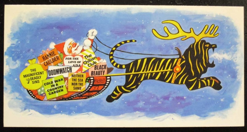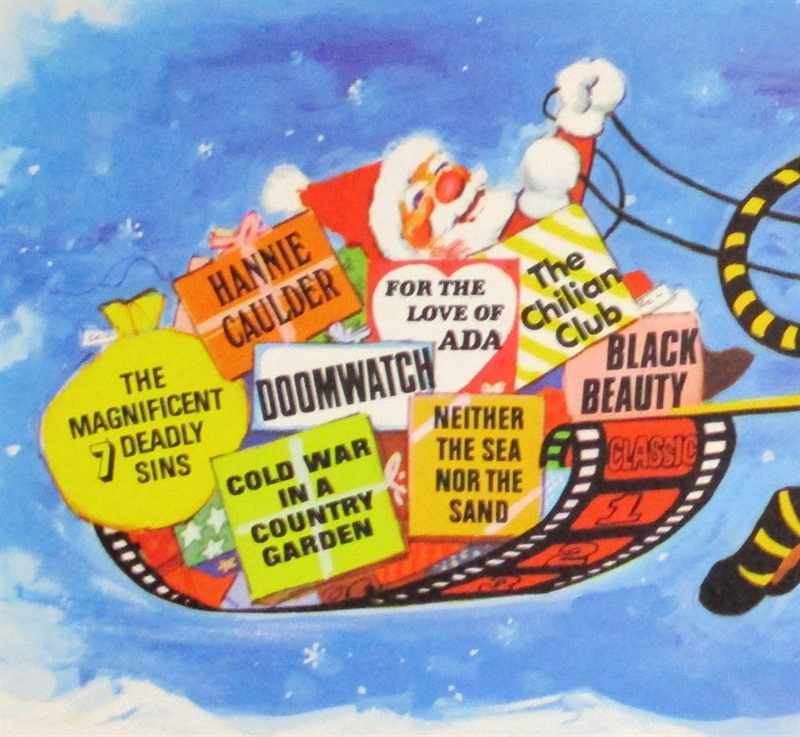 We do not believe the artwork on the card was by Chantrell though he frequently worked with Tigon. Santa's sleigh is shown containing film titled Christmas presents including "The Magnificent Seven Deadly Sins" (1971), "Hannie Caulder" (1971) "For The Love Of Ada" (1972), Doomwatch" (1972) & "Neither The Sea Nor The Sand" (1972), all films which Chantrell created posters for.