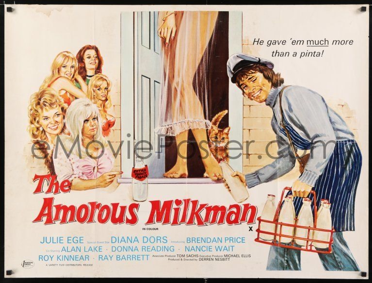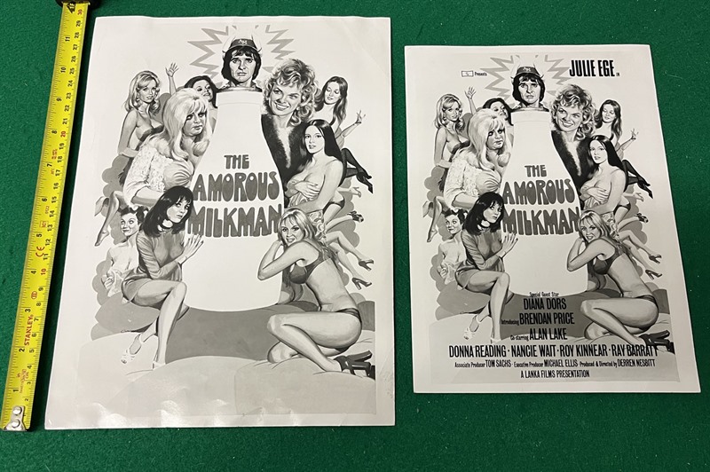 Two b/w photos (largest 8 3/4"x 11 5/8") showing Chantrell artwork for the British sex-comedy "The Amorous Milkman" (1974).