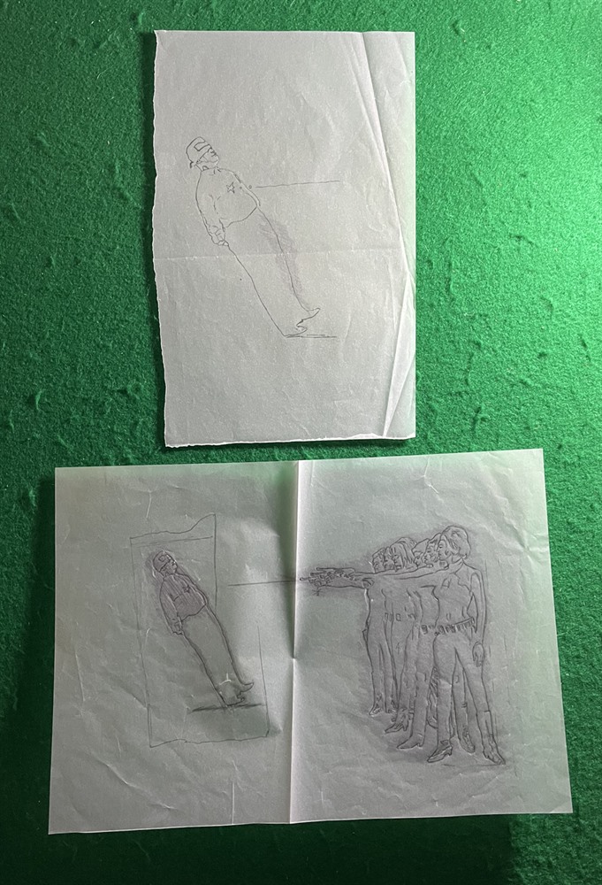 Two tracing paper pencil artworks (largest 8 1/4"x 12") related to Chantrell's work for the James Bond spoof "Carry On Spying" (1964).Both pieces relate to the illustration in the bottom right corner of the Quad poster: the female firing squad & victim & both are in Chantrell's hand (we show an image of the Quad poster for reference courtesy of