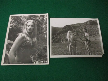 One photo is from "When Dinosaurs Ruled The Earth" (1970) showing the stars Victoria Vetri & Robin Hawdon (minor paper loss bottom lft corner) & the other currently unidentified but most likely another Hammer "One Million Years BC" type Hammer production (3/4" tear to right side).